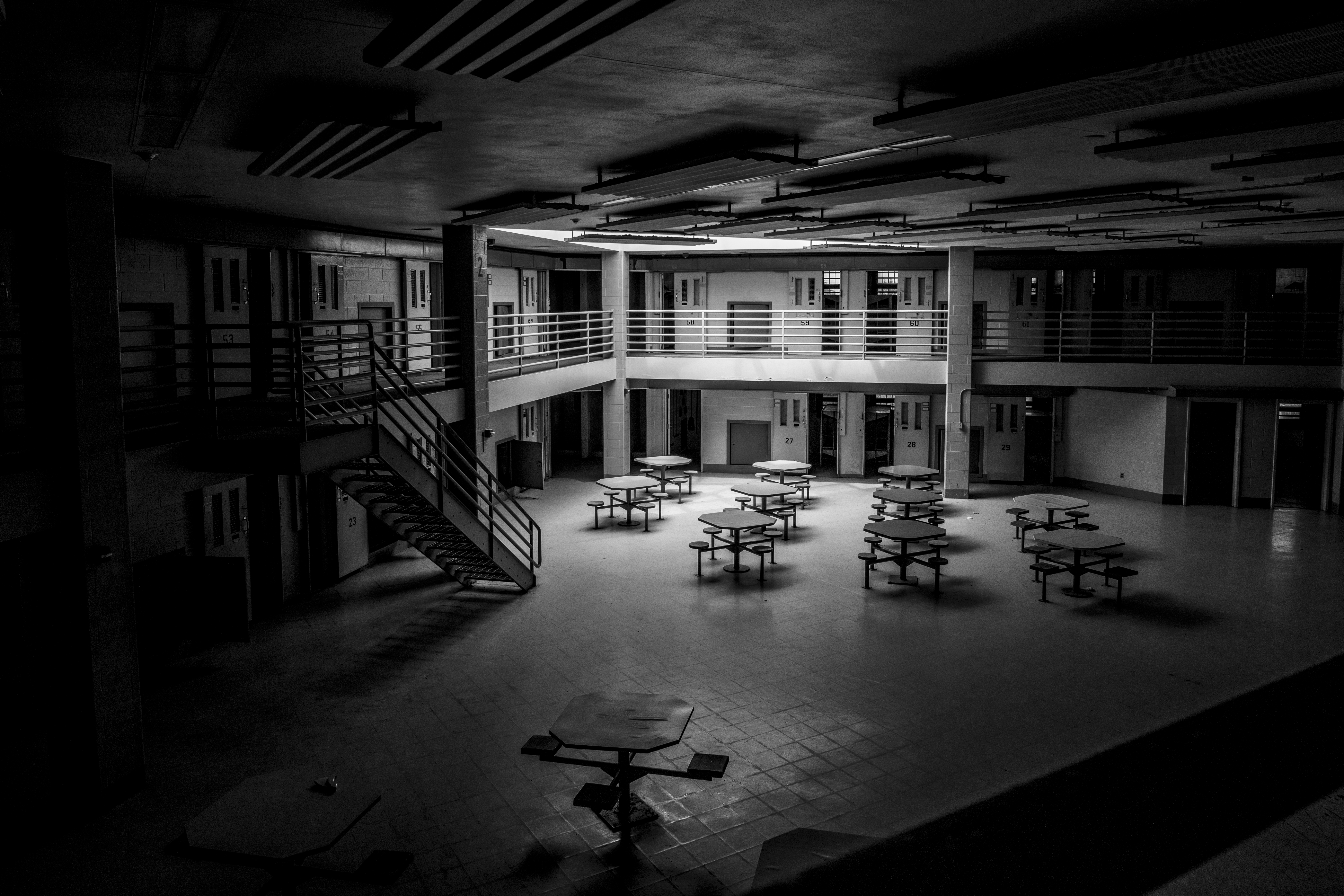 Previous Image Next Image Abandoned jail block in black and white Sunshine from skylight into common area of cell block in abandoned prison in black and white.