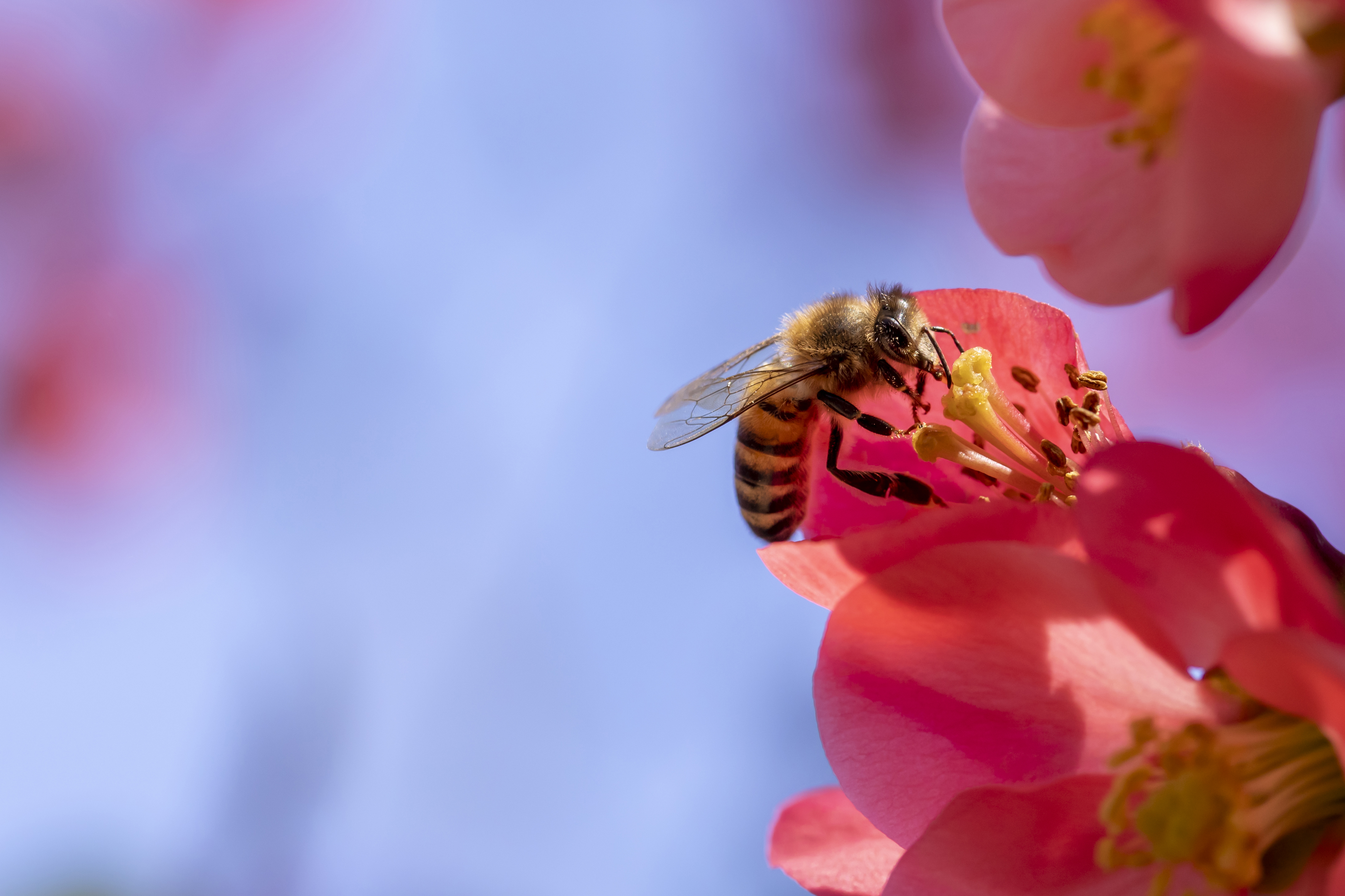 Macro close up of honey bee pollinating flowering quince bloom on bush in spring against blue skies with copy space.