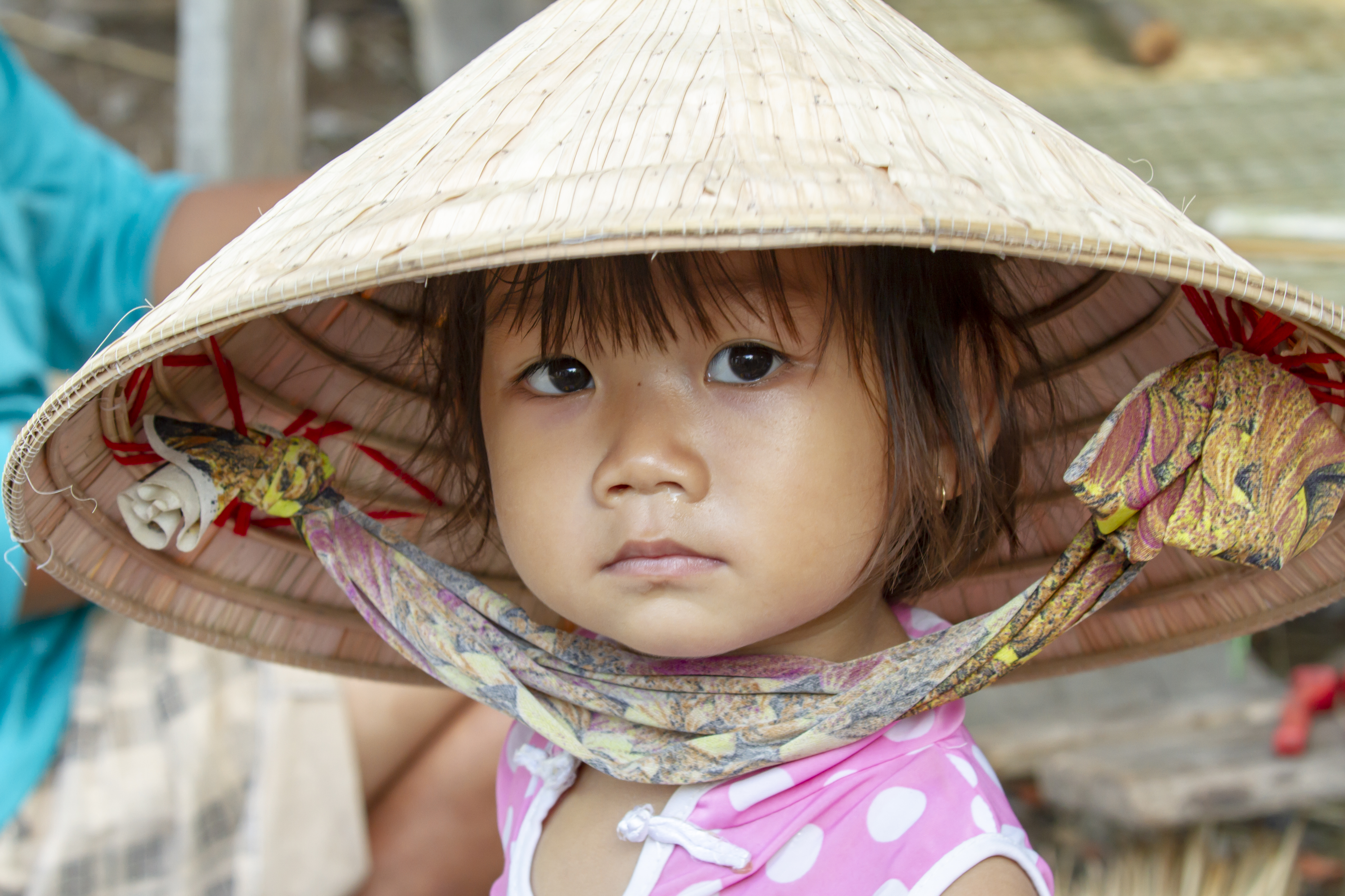 Sadec, Vietnam – March 7, 2019 : Small girl in traditional straw hat in rural village in Mekong River Delta in Vietnam.